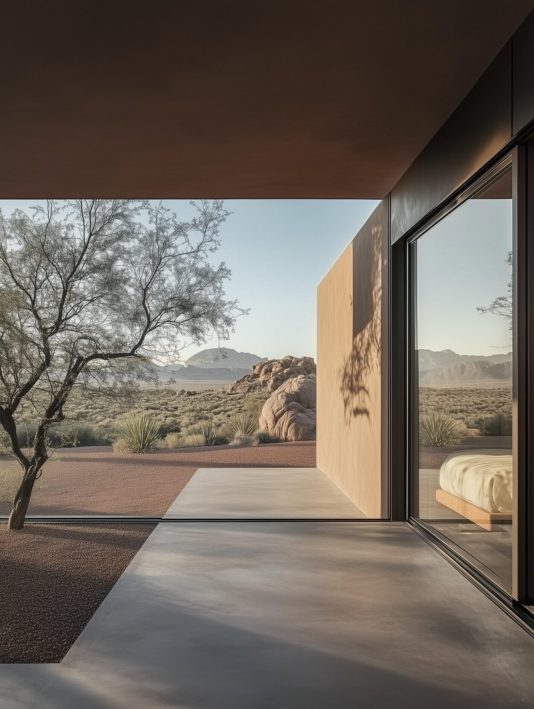 Nestled within the arid yet strikingly beautiful landscape of Joshua Tree, Casa Del Sol is a modern sanctuary that seamlessly integrates with the raw and rugged desert environment. This architectural endeavor was designed to embrace the interplay of sunlight, shadows, and the serene vastness of the Mojave Desert. The site for Casa Del Sol lies within Joshua Tree’s expansive, otherworldly terrain, surrounded by its iconic rock formations and desert flora. The location’s isolation and openness inspired a design that focuses on solitude, mindfulness, and connection to the natural environment. The house was conceived as a dialogue with the desert—a structure that offers both shelter and exposure, where inhabitants can experience the unique rhythms of the desert sun and sky.