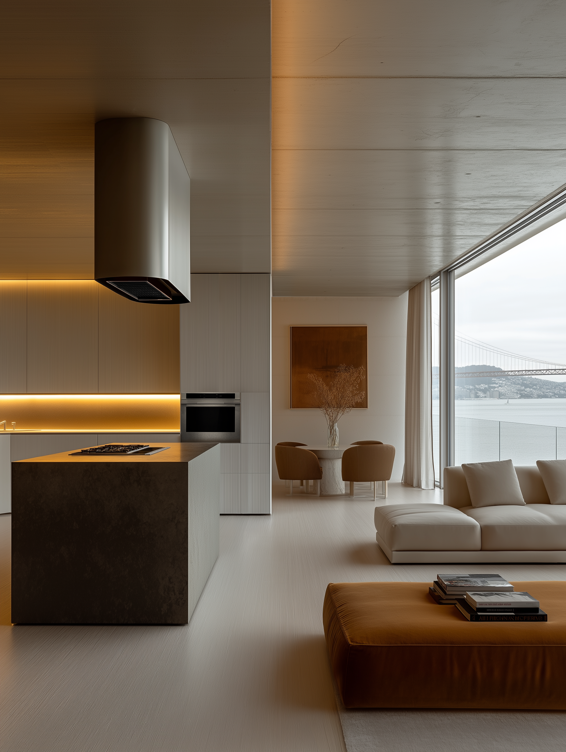 Golden Hour is a transformative interior design project set in a high-end apartment overlooking the San Francisco Bay. This remodel celebrates light, texture, and the seamless integration of design with its surroundings. Floor-to-ceiling windows frame iconic views of the Bay Bridge, while an open-plan layout ensures the apartment remains flooded with natural light throughout the day.